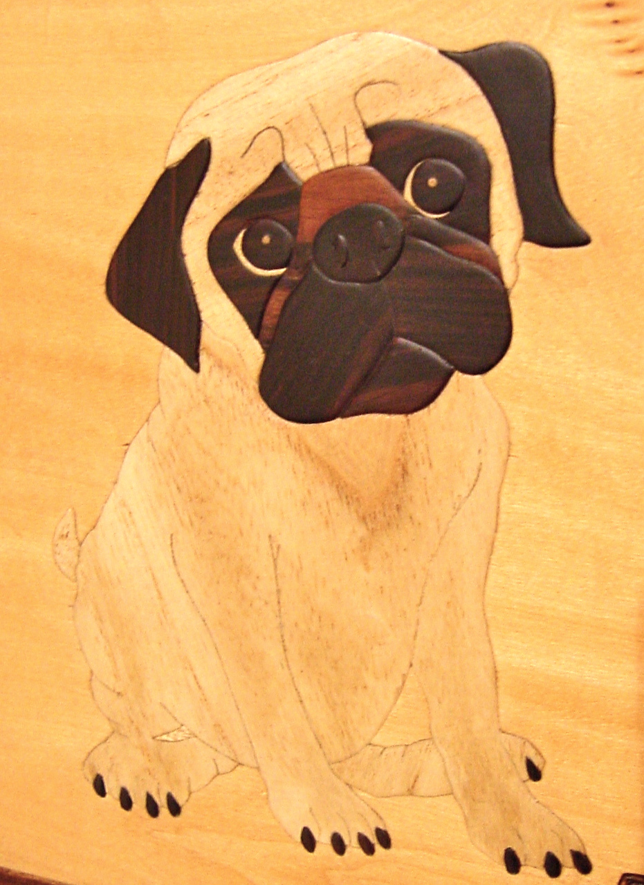 Send a a simple close-up photograph of your pet. Michio Nakamura will consider recasting your pet's image into the kumikie universe. His decision carries the day. He had the right wood in his extensive workshop to recreate this irresistable cutie-pie puppy, for instance.